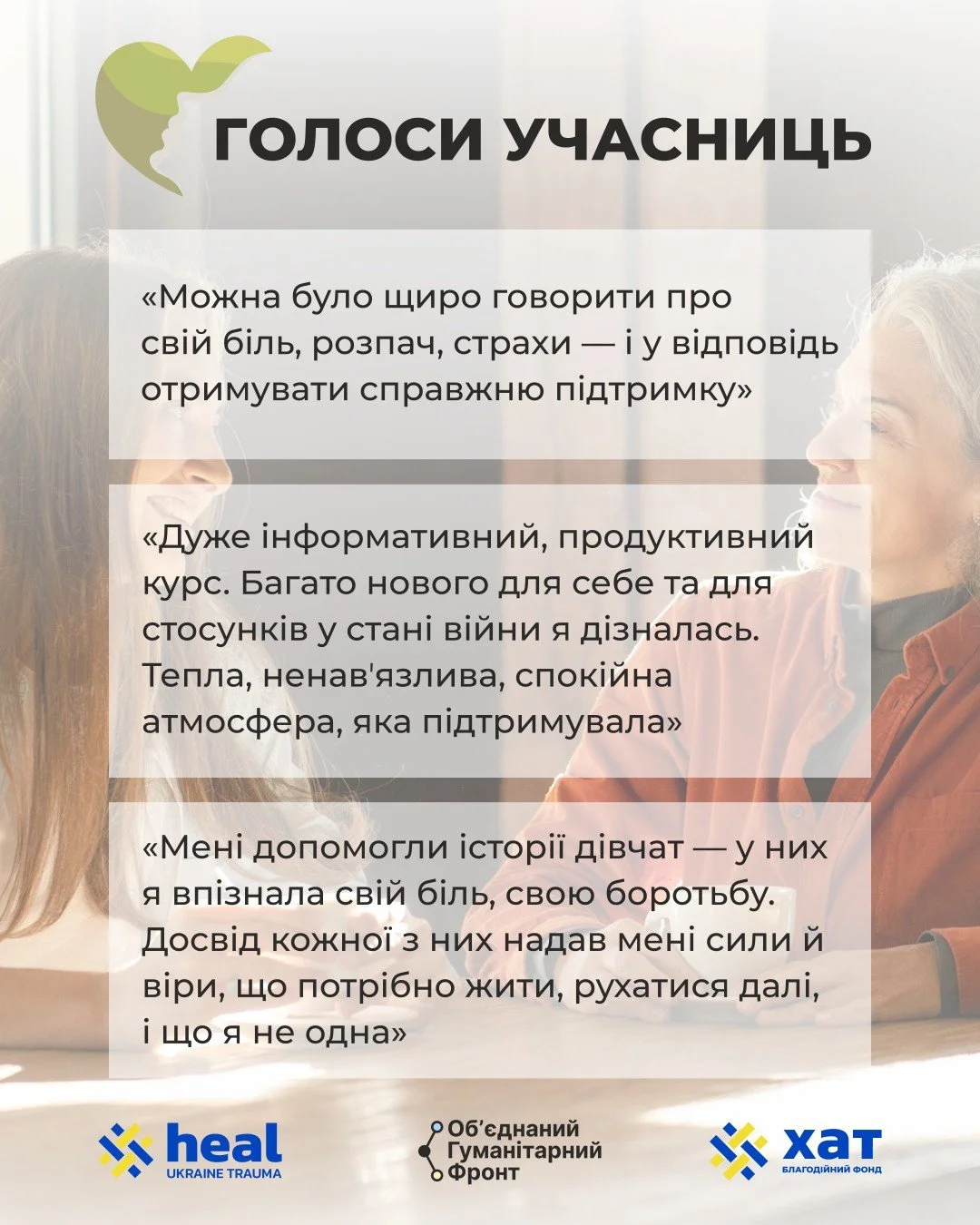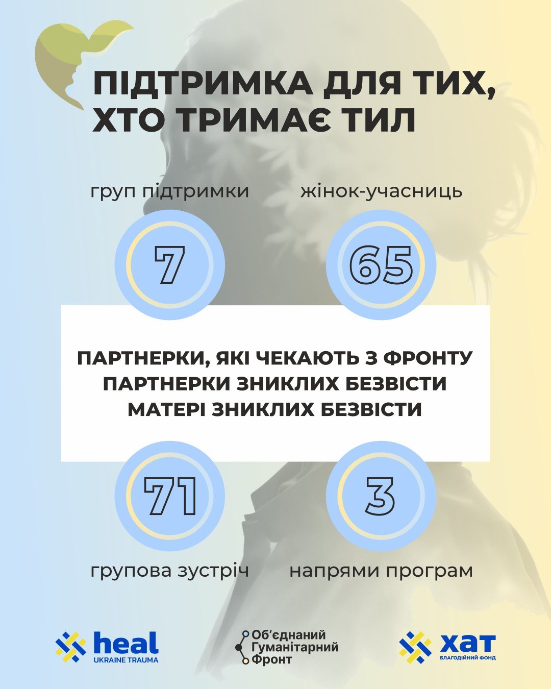 У 2025 році Heal Ukraine Trauma спільно з United Humanitarian Front започаткували та успішно реалізували програму груп підтримки для партнерок і матерів військовослужбовців.